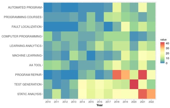 With respect to RQ4-4, Figure 14 shows the ten most frequent abstract 2-grams by year, in which colors vary from blue (low occurrence in publications) to red (high occurrence), i.e., using a color temperature scale. The increasing interest in static analysis, automated program repair, and automated test generation is readily apparent. Although less visible, machine learning and learning analytics have also increased slightly over the years. This indicates a large growing interest in improving automated feedback generation, as most topics gaining popularity are related to source code analysis (static analysis and machine learning—in the current context) and fixing (automated program repair, automated test generation—including a counter examples—fault localization, and machine learning) techniques. Moreover, feedback for teachers through learning analytics seems to now be a topic of interest within the area of automated assessment. Note that, for this visualization, the set of generated 2-grams was preprocessed to remove common terms (e.g., science, introductory, programming, paper, work, result, etc.) and match synonyms (e.g., apr tool, repair tool, and program repair count for the same 2-gram). Each publication counts at maximum once for any 2-gram.