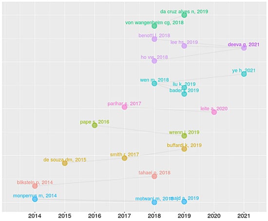 Figure 16. Historiographical representation of a network map of most relevant co-citations under feedback topic. References included: von wangenheim cg, 2018 [28]; da cruz alves n, 2019 [29]; benotti l, 2018 [34]; ho vw, 2018 [35]; lee hs, 2019 [36]; deeva g, 2021 [33]; wen m, 2018 [12]; liu k, 2019 [15]; bader j, 2019 [21]; ye h, 2021 [37]; parihar s, 2017 [38]; leite a, 2020 [39]; pape s, 2016 [40]; wrenn j, 2019 [41]; de souza dm, 2015 [42]; smith r, 2017 [43]; buffardi k, 2019 [44]; blikstein p, 2014 [45]; tahaei n, 2018 [46]; monperrus m, 2014 [26]; motwani m, 2018 [27]; majd a, 2019 [47].