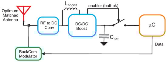 A primitive example of BackCom design principles can be observed in the use of radio-frequency identification (RFID) technology [] in vehicular communications. Nonetheless, the expected performance associated with a batteryless BackCom-based IoT node requires communication capabilities and ranges that surpass those of a typical RFID device scenario. Following this, the final step in improving the feasibility of IoT paradigms, with respect to power limitations, is the development of fully batteryless BackCom nodes that implement specific solutions supporting both burst and low-rate operations [].