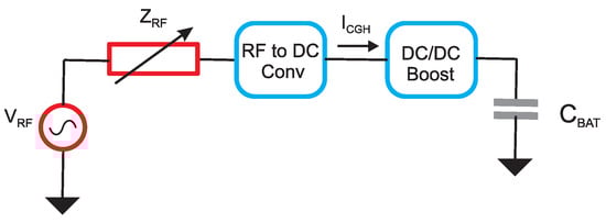 where is 0.34 V, in accordance with the experimental results [], and on the base of manufacturer specifications []. Parameters and represent, respectively, the output voltage and the output impedance shown by the RF to DC rectifier toward the DC/DC step-up converter.