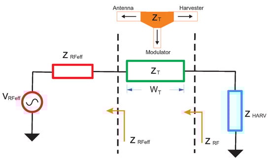 In the present architecture, in order to reduce losses and maximize the compactness of the node, the impedance matching of the voltage tripler is obtained following the approach described in []. However, in a BackCom node architecture (Figure 1), the presence of the modulator block cannot be neglected in the harvesting phase (modulator in high impedance state). As a consequence, the identified optimum matching impedance differs from the design impedance that is exhibited by the antenna . The effect of the modulator can be considered by modeling it as a microstrip line with a characteristic impedance and a length , as illustrated in Figure 3.