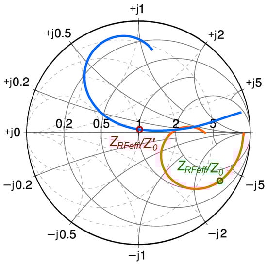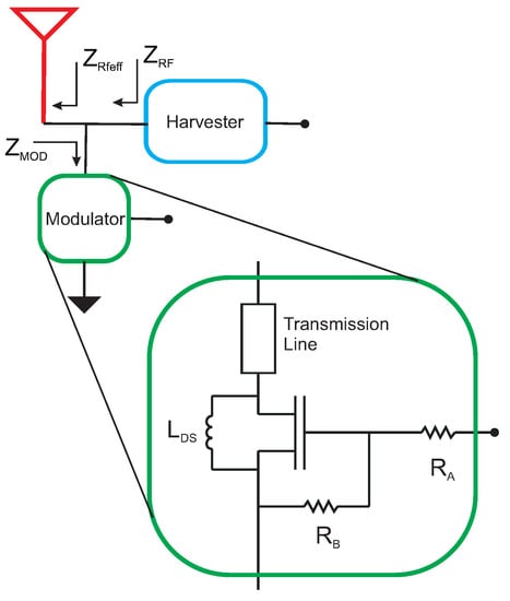 The values of both and were calculated, starting from the dimensions of the modulator interconnection (the proposed modulator based on a cold-FET configuration, as explained in the specific subsection) between the antenna and the tripler. It is assumed that the modulator exhibits a high impedance at this junction during the harvesting; thus, the can be simply evaluated on the basis of the well-known transmission line equation and the and values.