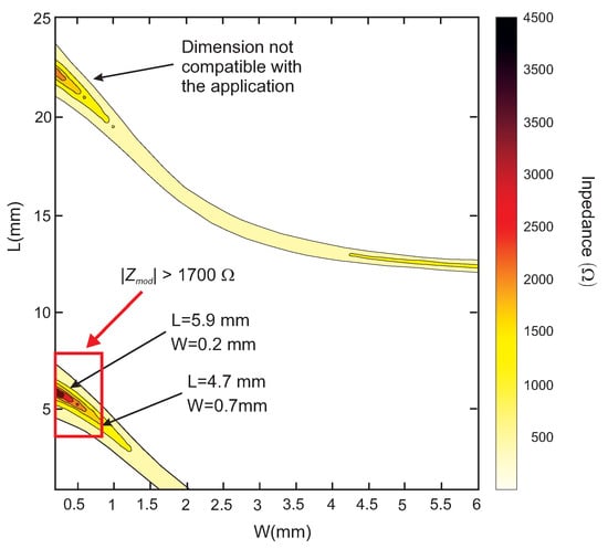 The dimensions of the modulator feeding line fulfill the conditions of the maximum power transfer given by (3) and maximum compactness. Specifically, the resulting optimal values are mm and mm. These values lead to mm and ; thus, according to (2), the value of the optimum antenna impedance is .