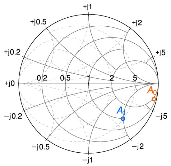 where each is the simulated reflection coefficient at the antenna port related to the i-th symbol state of the modulator. Through simulations, using the optimal dimensioning of the modulator feed line, the reflection coefficient results, respectively, in = 0.352, = 213 degrees for , = 0.968, and = 347 degrees for , as illustrated in Figure 6, where the two symbols are depicted in the Smith chart. Moreover, from Equation (4), the expected value of the modulation depth is = 0.60.