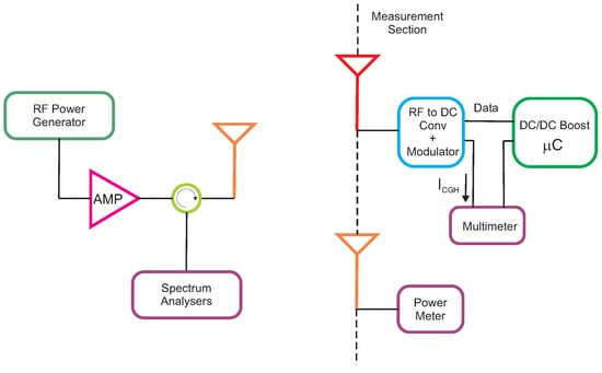 The measurement setup schematic is illustrated in Figure 10, and consists of a radio link with the node under test from one side and a TX/RX system from the other side. The node, being implemented in the split form illustrated in Section 3, simplifies the testing procedure. Such a configuration allows for accessing the terminal between the RF to DC converter and the DC/DC boost, enabling the measurement of the , as well as the data line monitoring. On the contrary, the TX/RX system makes use of an RF power generator and a power amplifier in the transmitter path, while the receiver is implemented by means of a spectrum analyzer. The two paths are connected to a single antenna array through a circulator.