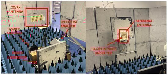 The previously described setup includes a reference antenna on the same BackCom node measurement section. The latter is connected to a power meter in order to evaluate, at the reference section, the effective impinging power. Based on this setup, the BackCom node behavior was characterized. The implemented measurement setup is illustrated in Figure 11