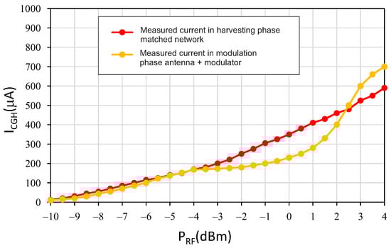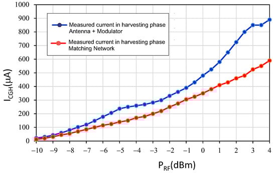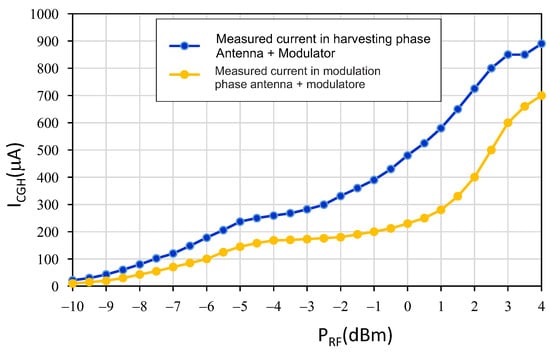 Figure 12 compares the of the proposed architecture with respect to the one exhibited by a standard configuration, using a matching network to implement the optimum impedance. The latter does not include the modulator block. was evaluated in both configurations, considering the same RF power at the RF to DC converter input by means of the power meter connected to the reference antenna, and taking into account the optimum antenna gain. The architecture proposed in the present paper has demonstrated an overall improvement in at every input power level. In particular, at the design reference, the RF power is about −5 dBm (at the input of the RF to DC converter section), and the measured current is 237 A for the node and 145 A for the standard structure with an improvement of about 92 A.