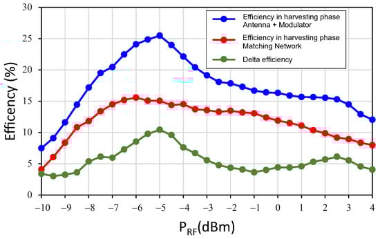 Figure 16 confirms that the comparison between (supplied by the node in the backscattering state) and the corresponding value in the standard configuration (implementing the matching network in the harvesting state) are very similar across all input power levels. This behavior contributes significantly to delaying the discharge of and, as a consequence, increases the time slot for communication.