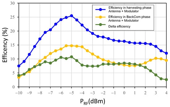 Figure 13 illustrates the efficiency of the same two configurations. The measurements confirm that the harvesting efficiency of the BackCom node is improved compared to the standard configuration across the entire range of input power levels. Here, the efficiency is calculated as the ratio of the power supplied to the DC/DC with respect to the impinging power at the input of the RF to DC converter, as described in