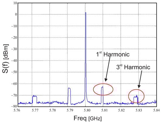 The results are illustrated in Figure 17, showing the spectrum of the backscattered signal modulated by the square wave. The figure illustrates the signal spectrum across the carrier, where the fundamental, as well as the third harmonic of the modulating signal, are recognizable. The EEPROM, emulating the controller block, is active for the discharging time interval (i.e., , as stated in []) for a maximum of 360 ms, which is independent from the impinging power. On the contrary, the charge time interval depends directly on the latter. For a power level of about −5 dBm at the input of the RF to DC converter, measurements show a charging time of 27 s. However, the discharge is a slightly critical phase for the modulation. As a matter of fact, the decrease in affects the performance of the EEPROM, which in the final part of generates a square wave with a frequency that is below the canonical 10 MHz. As a consequence, both the spectrum of the first and third harmonics show a slight widening.