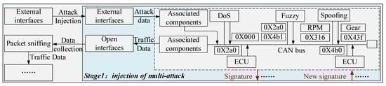 We took the internal structure of the vehicles as an example to show the attack injection and data collection processes of ICTs, as shown in Figure 2. The model was trained and tested using the attack datasets collected by the Korean hacker and countermeasure research laboratory []. The datasets included the typical attack types as described in Section 3.1. These were DoS attacks, fuzzy attacks, gear attacks, and RPM attacks. In modern vehicles, the CAN bus is the most common communication mode, and hackers can easily attack vehicles due to their lack of corresponding security mechanisms. In Figure 2, taking the DoS attack as an example, we injected the attack data into the CAN bus with the CAN ID 0X000 through the external interface of the vehicle and then collected the attack data through packet sniffing, followed by the process shown in Figure 1. Other attack injection methods are similar.
