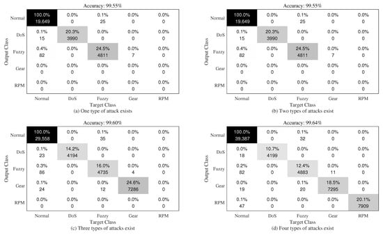 In order to evaluate the prediction performance of the model more accurately, the evaluation indexes similar to the binary classification model were obtained according to the confusion matrix of each category, namely, Accuracy, Recall, Precision, and F1-score []. In the multiple classification model, a certain category (such as normal) was defined as a positive category, while the other categories (DoS, Fuzzy, Gear, and RPM) were defined as negative categories, and different positive and negative categories were selected in turn. Then, the true-positive () rate could be calculated for each type of attack, indicating that normal data were correctly identified; false-positive () indicates that the malicious attack data were identified as normal data, false-negative () indicates that normal data were identified as malicious attack data, and true-negative () indicates that normal data were correctly classified. The corresponding evaluation index could be calculated as: