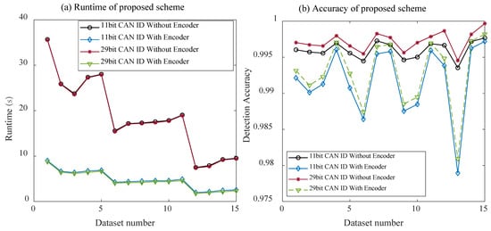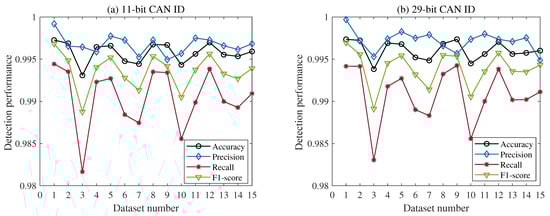 From Table 4, it can be seen that the proposed framework could successfully detect various types of attack data in both the 11-bit and 29-bit CAN ID, and the values of accuracy, precision, recall, and F1 score in the 11-bit CAN ID were 99.56%, 98.95%, 98.21%, and 97.75%, respectively. In the 29-bit CAN ID, the values of accuracy, precision, recall, and F1 score were 99.24%, 99.95%, 99.04%, and 98.84%, respectively. The detection results further verified our findings that the combination of OTA signature updates and an automatic encoding CNN could not only detect various types of mixed attack data but also improve the detection accuracy of intrusion detection systems.