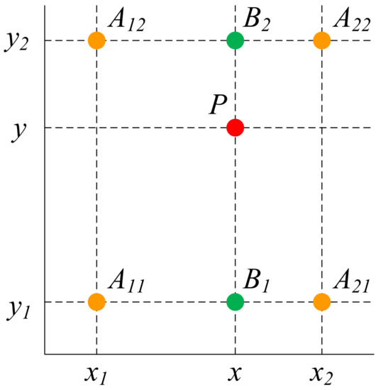 As shown in Figure 3, in the Bilinear algorithm, assuming that the values of function f at A11, A12, A21 and A22 are known, in order to obtain the values of unknown function f at point P = (X, Y), linear interpolation operations need to be performed in X and Y directions respectively. Orange dots A11, A12, A21 and A22 are known as four-pixel dots. X-direction linear interpolation is to insert green point B1 in A11 and A21, and insert green point B2 in A12 and A22. P point is calculated by Y-direction linear interpolation of B1 and B2 obtained in the first step. It can be expressed as Formulas (1)–(3).