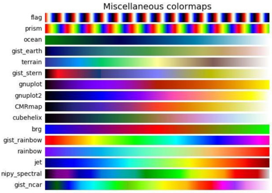 Although a gray-scale image can present the overall structure and features of program samples to a certain extent, it still has some shortcomings in the performance of some internal features and visual interaction analysis. Therefore, we performed color enhancement on the generated code image. Among various colormaps categories, we chose Miscellaneous, which is more suitable for the characteristics of discrete instruction byte sequences, for color mapping. In Miscellaneous, we chose the Rainbow ribbon setting with a larger color span and more obvious boundary value contrast (as shown in Figure 4) to add color attributes to the image, to enhance the color contrast of the generated code image and enrich the image information, which is very helpful to improve the visual discrimination and analysis effect of coarse-grained manual analysis in practical application.