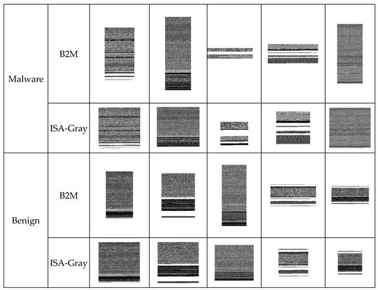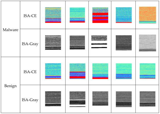 Figure 8 presents a comparison between the code images generated by the two methods. We selected five files from malware and benign software for demonstration and comparison. In these two types of file images, the upper side is the code image (ISA-CE for short) generated by the proposed method using both the amplitude adaptation and color enhancement mechanisms, and the lower side is the image generated by the proposed method using only the amplitude adaptation mechanism in Experiment 1 (ISA-Gray for short).