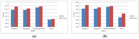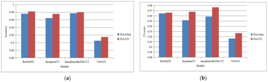 From Figure 9a,b, it can be seen that the inceptionV3 model has the most improvement in both detection accuracy and F1-score. This is because the model uses the Inception module, which is very sensitive to the color and brightness features of the image, and the color enhancement mechanism also enhances the texture features. Therefore, the results of the VGG model are also significantly improved.