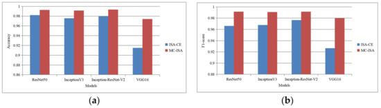 Combining Figure 7a,b, it can be seen that although the accuracy improvement of VGG16 is not significant compared with the other three models, the F1-score improvement of VGG16 is very significant, indicating that our visualization method is very effective in enhancing the category discrimination of samples.
