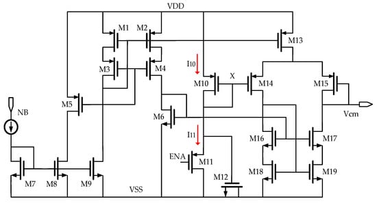 Transistors M16 to M19 form a cascode current mirror as an active load to improve the gain of the cascode amplifier. The gate of M15 operating as negative input of the cascode amplifier is connected to the output (Vcm) to form a voltage follower. The transistor M12 is an MOS capacitor used for the establishment of Vcm. When ENA = 0, M11 operates in the saturation region, which is equivalent to an active load. As illustrated in Figure 2, the currents flowing through M10 and M11 are I10 and I11, respectively, which are expressed by Equations (2) and (3).