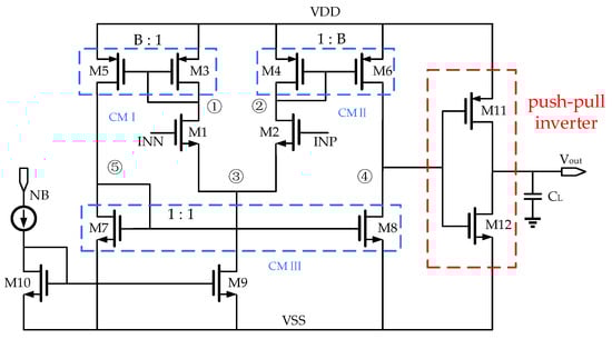The OTA shown in Figure 3 is a symmetrical OTA that is more symmetrical than the Miller OTA and improves the matching to provide better offset and CMRR specifications []. The symmetrical OTA consists of one differential pair and three current mirrors (CMs), CMI, CMII, and CMIII, respectively. The differential input pair M1 and M2 is loaded with two identical current mirrors CMI and CMII providing a current gain B. A sufficient voltage gain is provided by the symmetrical OTA to allow the output voltage Vout of the proposed comparator to meet the digital signal voltage requirements of the 12-bit SAR ADC. The symmetrical OTA operates in the open-loop state, and its output at node ④ is connected to the input of a push–pull inverter to drive the push–pull inverters consisting of transistors M11 and M12. Under the condition of using the same transistors, the push–pull inverters can effectively increase the output swing.