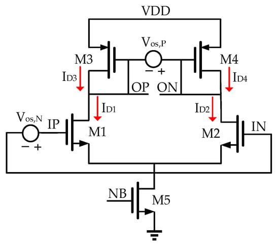 As the gain of each of the single-stage preamplifiers A0 to A6 is small, the multi-stage preamplifiers with cascade structure are adopted to improve the gain effectively while ensuring the bandwidth in the proposed comparator. In this study, the preamplifiers A0 to A6 use the differential amplifier structure shown in Figure 4 and determine the speed and precision of the proposed comparator. Transistors M3 and M4 are used as diode-connected loads. Transistor M5 operates in the saturation region and is equivalent to a tail current source to suppress the effect of the input common-mode level variations on the output OP and ON levels and the operation of transistors M1 and M2 []. As the diode-connected loads consume voltage headroom, there is a trade-off between the output voltage swings, the voltage gain, and the ICMR. The small-signal differential gain Avd can be calculated using Equation (6).