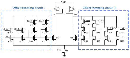 According to Equations (10)–(14), a novel offset trimming circuit is designed in the first-stage preamplifier A0 to effectively further suppress the offset voltage of the high-performance comparator by trimming the effective transconductance of the NMOS input pairs (M1 and M2), as shown in Figure 7. It consists of the perfectly symmetrical offset trimming circuits I and II. The differential pair transistors M1 and M2 and the offset trimming transistors M14 to M25 adopt the combination of series and parallel to solve the limitation of the resolution of the offset calibration caused by the minimum transistor size, and the adjustment precision is effectively improved. The transistors M6 to M13 are equivalent to MOS switches, realizing the series and parallel structure of the offset trimming transistors. The on and off of the equivalent MOS switches are controlled by the outputs KL<3:0> and KR<3:0> of the control logic circuit to determine the offset trimming variation. The series and parallel equivalent dimensions of the offset trimming transistors M14 to M25 can be calculated using Equations (15) and (16), respectively.