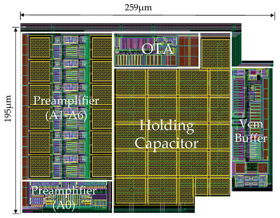 The layout of the proposed comparator in Figure 1 is shown in Figure 11. In the layout design, the matching of circuit blocks is improved by a symmetrical arrangement of the preamplifiers A1 to A6 for the multi-stage amplifiers and the offset cancellation capacitors C1 to C12, and the influence of layout design on comparator performance is reduced. The design of a large-area voltage-holding capacitor ensures the stability of the common-mode voltage Vcm and suppresses power supply ripples. The overall layout area of the proposed comparator is 259 × 195 μm2.