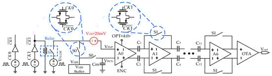 A conventional SAR ADC consists of a comparator, a digital-to-analog converter (DAC), and successive approximation register (SAR) control logic. Since the offset voltage of the comparator is one of the main factors that limit the accuracy of SAR ADCs, a self-calibration technique based on the structure of a conventional SAR ADC is proposed in this paper to eliminate the offset voltage of the comparator automatically. Under the control of a calibration logic circuit based on self-calibration technology, the conversion error caused by nonidealities such as line resistors could be compensated to a minimum. Figure 1 shows the structure of the proposed self-calibration comparator applied in a 12-bit SAR ADC system, which consists of a common-mode buffer (Vcm Buffer), seven-stage preamplifiers (A0 to A6), and an open-loop operational transconductance amplifier (OTA). The preamplifiers A0 to A6 are used to increase the speed of the comparator, while the first stage A0 is mainly used for small signal amplification. In order to improve the unit gain bandwidth (GBW) of the multi-stage amplifiers to increase their speed, the first stage A0 was designed with a wide bandwidth, and the last stage OTA was designed with a large swing rate.