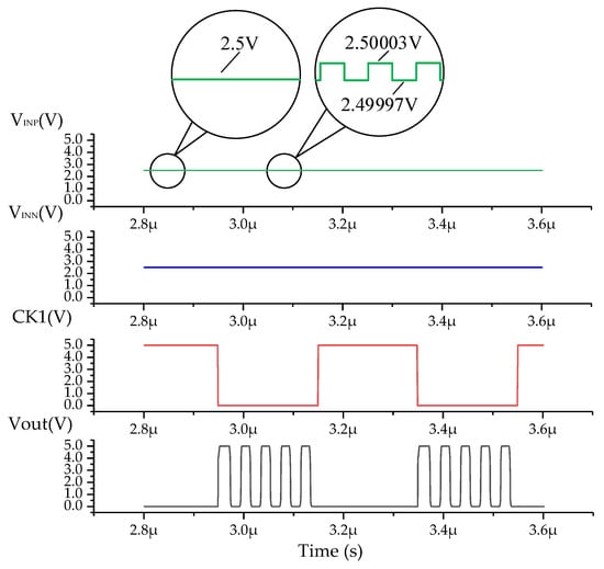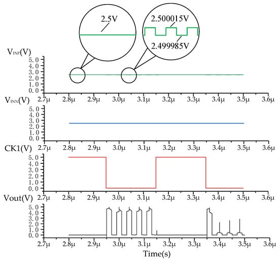 The transient simulation results of the proposed comparator are shown in Figure 14. During the sampling-phase period, the clock signal CK1 is a logic high (VDD), SR turns off, and VINP = VINN = 2.5 V. During the comparison-phase period, the clock signal CK1 is a logic low (0), SR turns on, and VINP = VPLUSE. When VINP > VINN, the output is Vout = 1, whereas the output is Vout = 0 when VINP < VINN. The results show that the proposed comparator can correctly output high and low levels at the conversion rate of 2.5 MS/s and eliminate the influence of the input offset voltage Vos effectively. As shown in Figure 15, when the ripple on VPULSE is lower than 30 μV, the comparator is not able to correctly output high and low levels. Therefore, the precision of the proposed comparator is 30 μV.