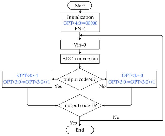 The flow chart of the self-calibration algorithm is shown in Figure 17. Before ADC conversion, the digital controller OPT<4:0> is initialized to 00000. As demonstrated in Table 1, the high bit OPT<4> = 0 since the drop voltage on the line resistor causes a positive conversion error, and the offset trimming circuit I is incorporated into the positive input (IP) of the preamplifier A0 in Figure 8. The low 4-bit OPT<3:0> varies from 0000 to 1111, and the corresponding offset variation varies from 0 to 9.15 mV. In the first conversion, when the input of the ADC Vin = 0 V, the output code is larger than zero due to the voltage drop VRS. Under the control of the calibration logic circuit, the low 4-bit OPT<3:0> is automatically increased by 1 to reduce the input offset voltage caused by VRS. In the second conversion, Vin = 0 is still used; when the output code is still larger than zero, the calibration logic circuit continues to increase the low 4-bit OPT<3:0> by 1. This calibration process is repeated until Vin = 0 and the output code = 0. The whole self-calibration operation is performed only when the chip is first powered on, so it does not affect the conversion time of the ADC during normal operation of the ADC.