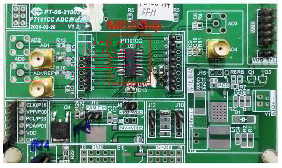 Two 12-bit SAR ADCs with and without a self-calibrated comparator were integrated into the two same-type MCU chips for testing, respectively. An MCU chip with the self-calibration comparator is named PT101CC, and another MCU chip without the self-calibration comparator is named PT101CB. Figure 18 shows the PT101CC and the printed circuit board (PCB) used for testing, and Figure 19 shows the PT101CB test environment.