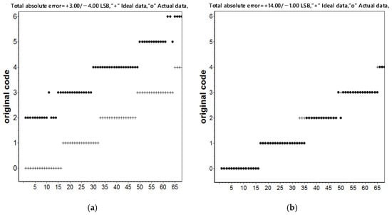 After the obtained test data are analyzed and processed by computer software, the output waveforms of the two 12-bit SAR ADCs in the PT101CB and the PT101CC were obtained and are shown in Figure 20a,b respectively. “o” and “+” represent the measured output signal and the ideal output signal of the two 12-bit SAR ADCs, respectively. Figure 20 shows that when Vin = 0 V, the output of the PT101CB is code = 2, while the output of the PT101CC is code = 0. The minimum voltage detected by the ADC based on the proposed comparator with the self-calibration is 0 LSB, and the offset voltage can be eliminated effectively.