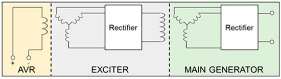 A Brushless Wound-Field Synchronous Generator (BL-WFSG) consists of an automatic voltage regulator (AVR), an exciter, and a main generator, as shown in Figure 1 [1,2,3]. Unlike the slip ring and brush combination that requires physical contact, the combination of the AVR and exciter serves to supply direct current to the field winding of the main generator without physical contact, and the main generator receiving the field current converts mechanical input power to electrical output power [4,5,6]. In addition, the AVR and exciter combination of BL-WFSG is equipped with a system that automatically adjusts the magnitude of the field current to maintain the same output in the entire operating speed range. This system can cut off the supply of field current quickly when problems such as a short in the winding occur to prevent further failure. For this reason, BL-WFSG has been used in various systems such as military applications that require high durability and reliability because of the absence of maintenance burden caused by wear and tear of brushes and slip rings.