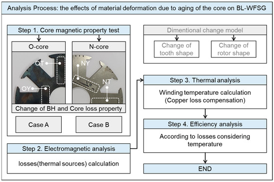 Figure 2 demonstrates the analysis process for material deformation of electrical steel due to aging and its effects on the electromagnetic, thermal, and efficiency characteristics of the BL-WFSG. In the first step, in order to confirm the material deformation with the aging of electrical steel applied to the BL-WFSG, a magnetic property test is performed on the core sheet of an old generator (O-core) operated for ~30 years and the core sheet of a newly manufactured generator (N-core). The O-core and N-core were both made of 50PN510 (by POSCO) which is no-oriented electrical steel, and there were no differences except for their usage time. The magnetic properties of the O-core and N-core are compared in two cases. The first case is the B-H curve characteristic, and the second case is the core loss characteristic. Through this, material deformation of the core with aging is confirmed. In the second step, electromagnetic field analysis is performed on the new and old generator based on the magnetic property test results to analyze the effects of material deformation with aging of electrical steel on the electromagnetic characteristics of BL-WFSG. In the third step, in order to analyze the effects of material deformation with the aging of electrical steel on the thermal characteristics of BL-WFSG, thermal analysis is performed on the old and new generators using the losses calculated through electromagnetic field analysis as heat sources, and their thermal characteristics are compared and analyzed. Finally, in the fourth step, in order to analyze the effects of material deformation with aging of electrical steel on the efficiency characteristics of BL-WFSG, the efficiencies of the old and the new generators are calculated and compared based on the results of electromagnetic field analysis and thermal analysis.