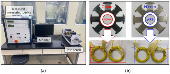 (a) B-H curve measuring device; (b) specimens of O-core and N-core for B-H curve test.