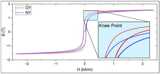 The B-H curve measurement test results are shown in Figure 4, where it can be observed that the knee point of the O-core was higher than that of the N-core. This means that the O-core had a relatively high magnetic flux density compared to the N-core for the same coercive force. Therefore, it is assumed that the B-H characteristics of this generator have improved rather than deteriorated with aging.