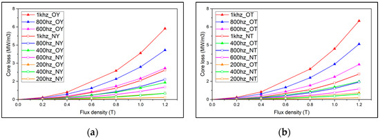 Core loss test results for (a) yoke parts and (b) tooth parts for O-core and N-core.
