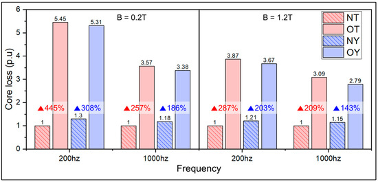 The core loss test results for each part are plotted in Figure 6. From Figure 6, it can be confirmed that a high core loss occurred in the O-core compared to that in the N-core for all frequency ranges. To further analyze the changes in core loss characteristics, bar graphs are presented in Figure 7, which presents the differences in core losses with respect to magnetic flux density at the base rotation frequency band of 200 Hz and the maximum rotation frequency band of 1000 Hz in the generator. At each frequency, the core loss in the yoke and tooth parts of each generator was averaged and compared to each other. It can be observed that at a relatively low flux density of 0.2 T, the O-core exhibits approximately 377% higher core losses at 200 Hz and 222% at 1000 Hz compared to the N-core. Similarly, at a relatively high flux density of 1.2 T, the O-core exhibits approximately 245% higher core loss at 200 Hz and 176% higher core loss at 1000 Hz compared to the N-core. From these results, it can be shown that the difference in core loss between the O-core and N-core decreases as the frequency increases. This is because at low frequencies, the change in magnetic flux density over time is slow, so the effect of changes in the magnetic properties of the core is more pronounced. However, at high frequencies, the change in magnetic flux density over time is fast, so the effect of changes in the magnetic properties of the core decreases.