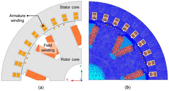 (a) Electromagnetic field analysis model (1/4); (b) Meshed model (1/4).
