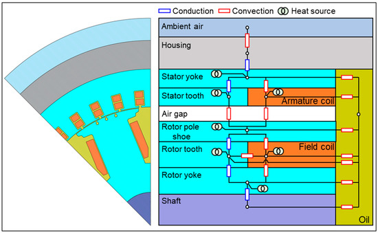 Thermal analysis methods include Computational Fluid Dynamics, Finite Element Analysis, and Lumped-Parameter Thermal Network (LPTN). In this study, thermal analysis is performed using LPTN, which has the advantage of shorter analysis time [13,14,15]. In order to perform the LPTN, the heat transfer coefficients considered the cooling conditions, and the heat sources are required. Since the external housing cooling and oil spray cooling were applied to the actual BL-WFSG, the heat transfer coefficients are calculated considering these two cooling methods by referring [13,16,17]. The losses calculated by electromagnetic field analysis—which are rotor core loss, stator core loss, armature winding copper loss, and field winding copper loss—are reflected as heat sources.