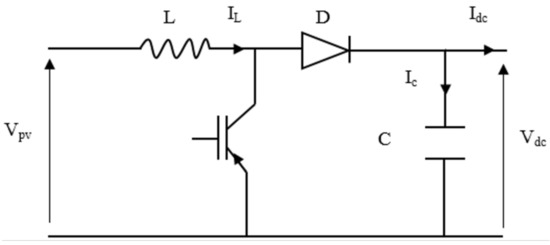 The boost converter shown in Figure 2 is a popular form of converter made up of two energy storage components, the inductor L and the capacitor C. The inductor stores energy in a magnetic field during switch closure, and when the switch opens, it distributes energy to the load. The capacitor contributes to smoothing the output voltage and reducing ripple. The switch state changes between on and off states in response to the control signal u. The on state is in the time interval of , while the off state is in , where D is the duty cycle. The duty cycle represents the ratio of time that the switch is closed to the entire switching period [38].