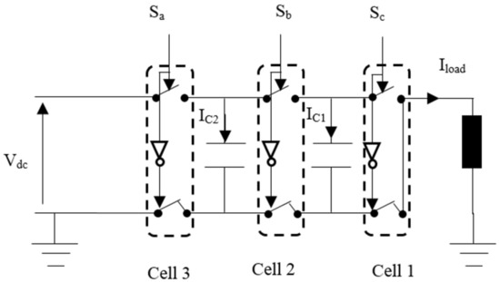 The multicellular converter array is made up of a number of separate capacitor cells, each with two complementary switches [39]. Accurate voltage specifications for each cell’s terminals are necessary to ensure appropriate functioning. The eight alternative modes of operation for a three-cell converter are depicted in Figure 3. It is critical to recognize that the multicellular converter array is used in a variety of electronic systems, including inverters, voltage converters, and energy storage devices. It transforms voltage or current energy sources into usable types of energy for powering electrical equipment. The use of complementary switches for each cell increases the conversion efficiency while decreasing energy loss. Furthermore, precise voltage specifications for each cell’s terminals are required to ensure system stability and reliability.