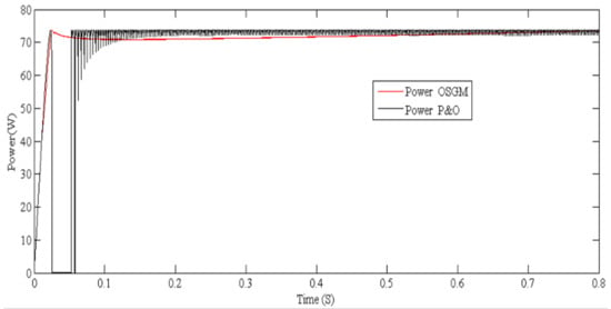 The OSGM approach not only improves response time and signal quality, but it also improves the system’s overall efficiency and stability. It tracks the maximum power point precisely and quickly, resulting in increased power production from the solar system. Reduced chattering ensures system stability and reduces the risk of system failure. Furthermore, the OSGM method is a more robust choice for MPPT control in solar systems due to its adaptability to changing environmental conditions and a wider range of operating conditions. The results presented in Figure 6 confirm the superiority of the OSGM method over the traditional P&O control method.
