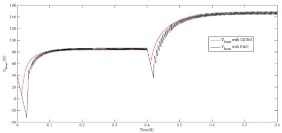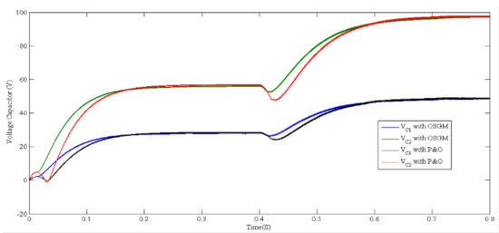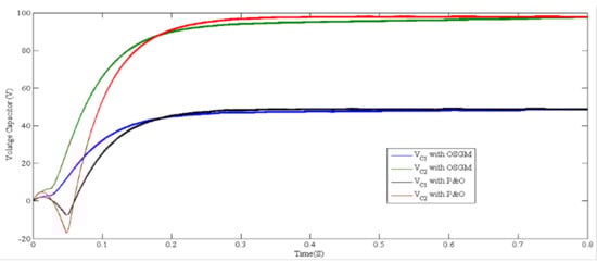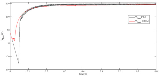 The results of the simulation in Figure 10 are clear in their demonstration of the superiority of the OSGM method over the P&O method when there is a change in the irradiance from 600 W/m2 to G = 1000 W/m2. The figure highlights the better energy quality and stability of the output voltage produced by the proposed boost method as compared to that of the P&O control.