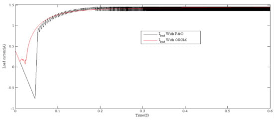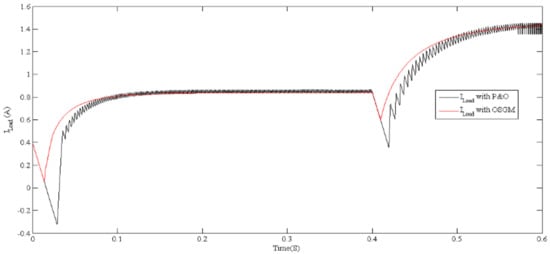 The OSGM control approach, in addition to its capacity to eliminate disturbances, provides a more steady and constant charging current, which is critical for assuring the appropriate working and lifetime of the battery or load being charged. This is owing to its capacity to identify the maximum power point precisely and promptly, resulting in a higher power output from the solar system and effective charging of the load. Furthermore, the OSGM method is a more robust choice for MPPT control in solar systems due to its adaptability to changing environmental conditions and ability to handle a wider range of operating conditions. Overall, the results presented in Figure 7 further highlight the benefits of using the OSGM method over the traditional P&O technique for charging applications.