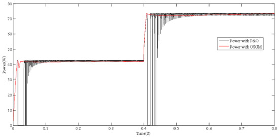 Apart from the previously mentioned results, it is worth noting that the OSGM technique also achieved a higher efficiency rate when compared to the P&O method. The higher output power and fewer oscillations produced with the OSGM technique demonstrate this. Furthermore, the OSGM method is well known for its robustness and adaptability to changing environmental conditions, which is an important factor to consider when choosing an MPPT algorithm for a solar power system. Overall, the simulation results presented in Figure 5 provide clear evidence of the advantages of utilizing the OSGM method over the P&O method in terms of performance and efficiency.