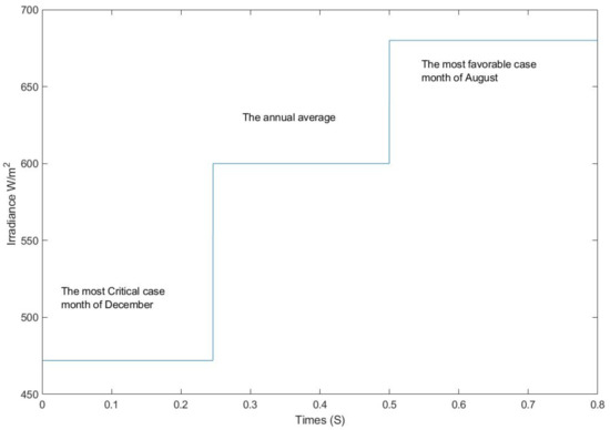 Three cases of illumination variation are shown in Figure 13, including the most critical case “month of December”, the annual average of illumination in the TFT zone in Illizi, Algeria, and the last most favorable case.