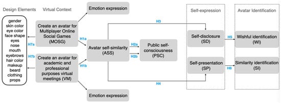 The capacity to shift one’s attention from the environment to oneself and back again is an essential component of self-awareness [38]. People’s attention is constantly drawn inward or outward, and public and private self-consciousness is a process of self-focus [39]. The idea of self-consciousness may be separated into two categories, private and public, according to current study results. A person’s private thoughts, feelings, and recollections are all instances of components of the self that are often concealed from others who are unfamiliar with the individual. That is the definition of “private self” [40,41]. Paying attention to inner thoughts and sensations is private self-consciousness. The phrase “I care passionately about the way I show myself” is an example of the public self-consciousness factor. This component is described as the general awareness of the self as a social object that has an effect on others [39]. Exposure to self-similar avatars, which may be made to resemble users, may have the same effects as mirrors and may promote public self-awareness. This is due to the fact that avatars may be created to resemble users [33]. Hence, we hypothesize: