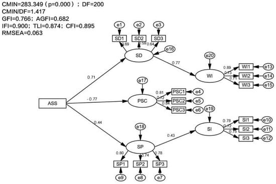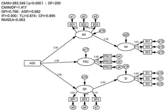 For validity analysis, we developed a confirmatory factor analysis (CFA) model (see Figure 3) based on the questionnaire content. The fundamental concept of factor analysis is to group variables based on the correlation between them so that variables in the same group have a high correlation, variables in different groups have a low correlation, and variables in each group constitute a common factor. As depicted in Figure 3, the validation factor analysis model fit index CMIN/DF = 1.48; RMSEA = 0.068; CFI = 0.942 indicates that the overall model fit is satisfactory and that the model fit has been successful.