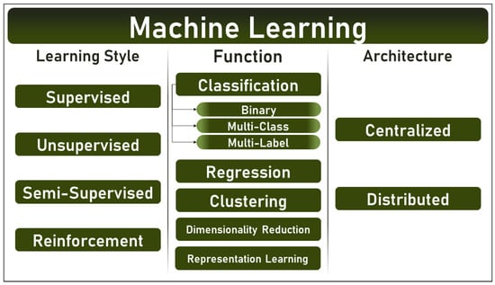Artificial intelligence and its descendant, machine learning, are used in a wide variety of real-world applications. Thousands, if not millions, of implementations are available in the areas mentioned in the previous section. Moreover, the algorithms of ML can be classified into different groups depending on their classification perspective. These algorithms are traditionally classified into supervised, unsupervised, semi-supervised, and reinforcement learning [,,]. However, this classification only considers the data analyzed by the model or the so-called learning style and ignores other possible classification bases. In this context, the function or goal of the algorithm as well as the architecture can serve as classification factors and provide an extended taxonomy for ML algorithms.